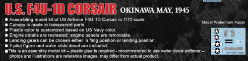 • Comes with decals to depict 3 marking options: 846th Fighter Squadron, Royal Navy, HMS Tracker (D24), Normandy, June 1944 (*), 58th Mixed Fighter Squadron, U.S. Navy, USS Guadalcanal (CVE-60), North Atlantic, January 1944, 33rd Mixed Fighter Squadron, U.S. Navy, USS Nassau (CVE-16), California Coast , September 1943