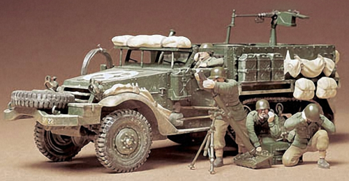 U.S. military planners experimented with half-track designs from the late 1920s and employed several vehicles during WWII. Among them was the M21 mortar carrier, which was officially adopted in June 1943. It featured a frame on the fighting compartment floor for the mortar that allowed sixty degrees of left and right traverse. The vehicle was also equipped with a 12.7mm heavy machine gun, bazooka, mines, and a wide range of other weapons. This model assembly kit recreates the M21 in detail and includes three figures for great diorama ideas.