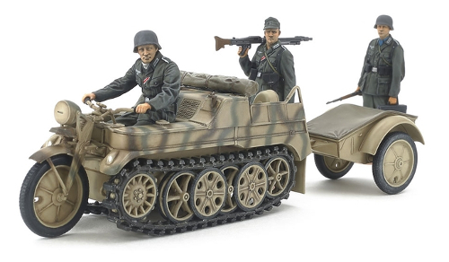 This 1/35 scale assembly model recreates an all-new version of the Kettenkraftrad, which was previously released in the 1/35 Military Miniature Series as Item 35029 back in 1973. The kit depicts a mid-production version, as opposed to the early-production version seen in the 1973 release. The model gives you more realistic scenery options with three infantry figures and a cart also included. The Kettenkraftrad was originally developed for commando units, but was found to be highly useful on the poor terrain in Russian territory. Of its numerous versions, the mid- production was the most prolifically manufactured, and was used to transport materials and even guns in the latter half of WWII.